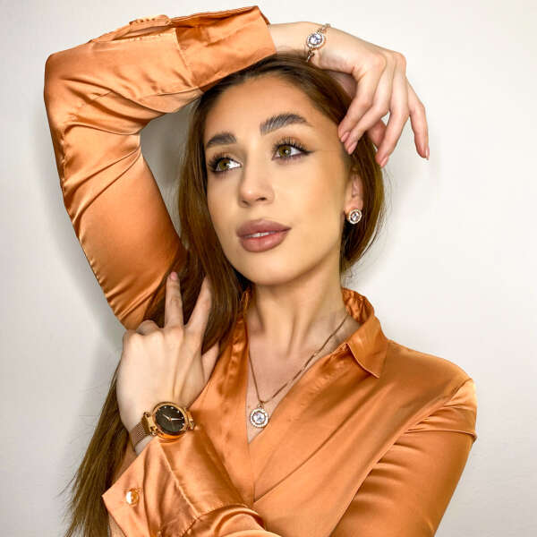 Всичко, от което една жена се нуждае, за да се чувства и да изглежда бляскаво. Невероятен комплект с луксозен часовник, колие, гривна и обеци.